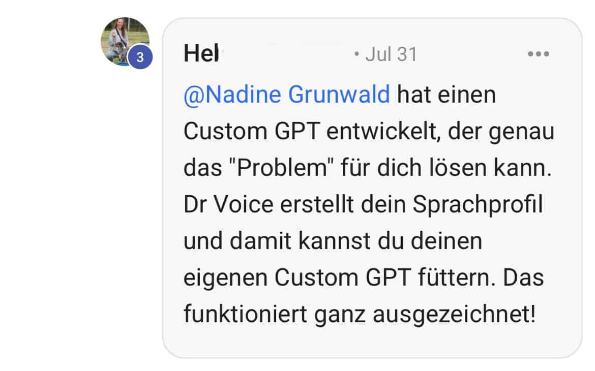 - Schreib mir eine kurze Nachricht, z.B. „Mein Content-GPT klingt nach KI, egal was ich mache."